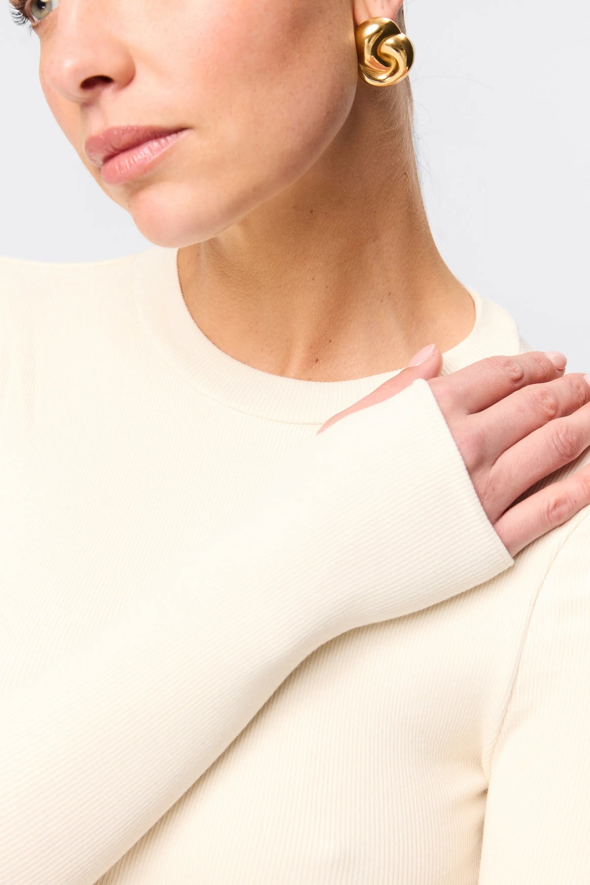 The Brooklyn Top in natural is your new go to knitwear piece. This extremely soft and lightweight top features a high round neckline and long sleeves with thumb openings. The top is conveniently designed to be paired with existing pieces in your wardrobe.